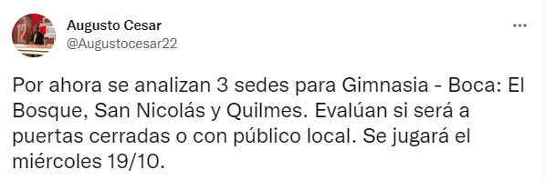 El Bosque, San Nicolás y Quilmesserían las tres candidatas a ser sedes del Gimnasia-Boca que no pudo continuar entre semana y que, posiblemente, defina el Torneo LPF en la última semana de competencia. En cuanto al público, César afirmó que “evalúan si será a puertas cerradas o con público local”, por lo que la medida aún no se hizo efectiva. Horas definitorias.