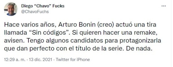 “Hace varios años, Arturo Bonin (creo) actuó una tira llamada “Sin códigos”. Si quieren hacer una remake, avisen. Tengo algunos candidatos para protagonizarla que dan perfecto con el título de la serie. De nada”, contraatacó Fucks.