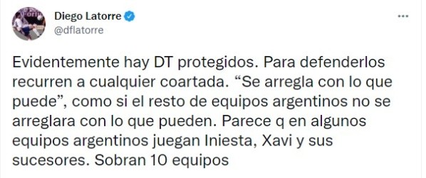 “Evidentemente hay DT protegidos. Para defenderlos recurren a cualquier coartada. “Se arregla con lo que puede”, como si el resto de equipos argentinos no se arreglara con lo que pueden. Parece q en algunos equipos argentinos juegan Iniesta, Xavi y sus sucesores. Sobran 10 equipos”, comenzó el actual comentarista.
