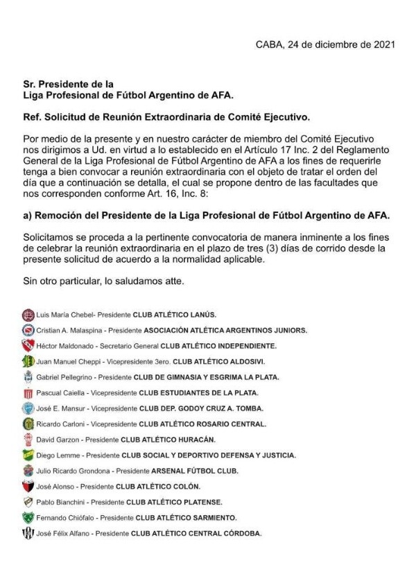 En principio, un grupo de ocho clubes habían dado a conocer públicamente su disconformidad con el rumbo y varias decisiones tomadas por Marcelo Tinelli enla Liga Profesional. Sin embargo, y en busca de intentar remover a Tinelli del cargo, necesitaban, de acuerdo al Artículo 16 Inciso 8 del Reglamento General de la LPF, la mitad más uno de los votos del Comité Ejecutivo. Es así como, posteriormente yen la antesala de la Navidad, salió a la luz una carta enviada por ¡15! clubes de la Primera División, para acercarse al objetivo. Días después, además, se habían incorporado Boca, Barracas Central, Patronatoy Unión al resto de losfirmantes, llegando a ser 19 las instituciones a favor de llamar a elecciones.