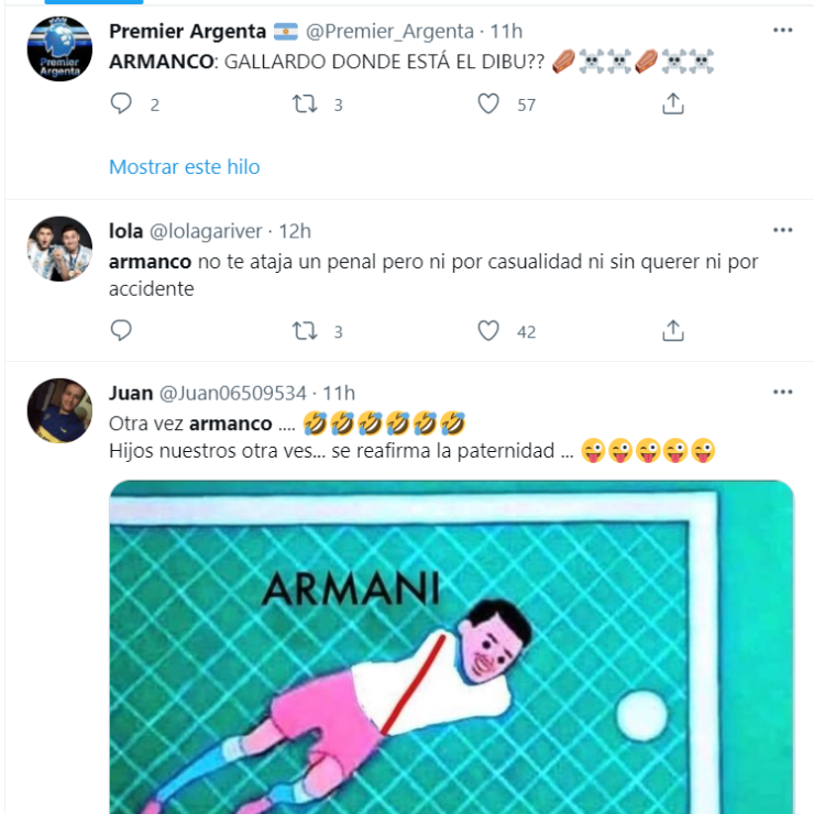 “Armanco” fue tendencia en Twitter toda la noche, haciendo un juego de palabras con el apellido del ‘1’ que tantas alegrías supo darle al Millonario desde que llegó. Está bien, es parte del folklore del fútbol. Mientras no falten el respeto…