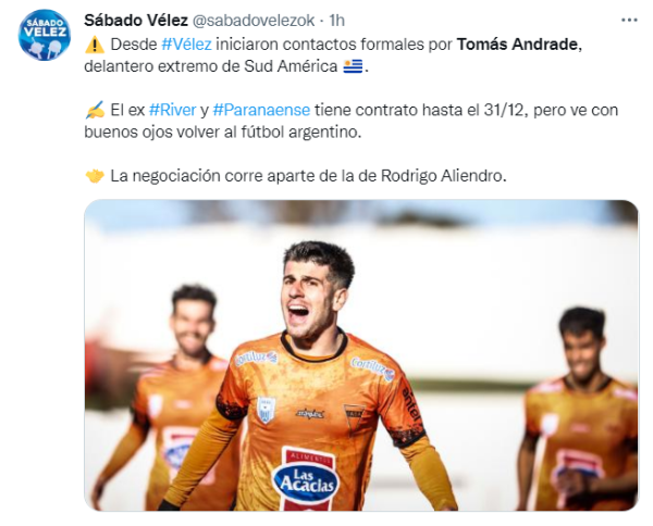 Medios partidarios de Vélez Sarsfield afirmaron que el Fortín ya inició contactos formales para hacerse de los servicios deTomás Andrade, cuya estadía en el club uruguayo está firmada hasta diciembre de este año. No obstante, informaron que el jugador “no ve con malos ojos” volver al fútbol argentino para vestir la “V” azulada. ¿Tendrá el protagonismo que tanto buscó en la Liga Profesional?