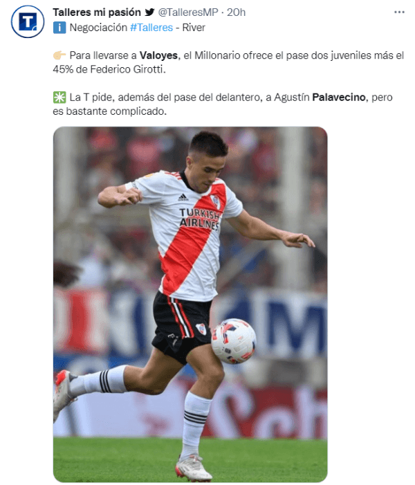 La respuesta de Talleres fue contundente: a pesar de la tentadora propuesta en relación a Girotti, desde Córdoba pretenden un porcentaje mucho más elevado de su ficha para poder hacerse completamente del delantero. Pero eso no es todo,porque, según cuenta el medio partidarioTalleres Mi Pasión, la “T” también le pidió a River a Agustín Palavecinocomo moneda de cambio. Una demanda que no tendrá demasiado éxito.