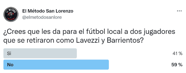Pero el pedido no salió del entrenador. A raíz de una encuesta en Twitter, donde el medio partidario El Método San Lorenzo preguntó si el ex PSG, además de Pablo Barrientos, podían retornar se sus respectivos retiros futbolísticos para volver a lucir la camiseta del Ciclón.