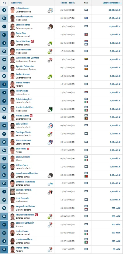 +De mayor a menor: la lista de los jugadores de River y sus precios
