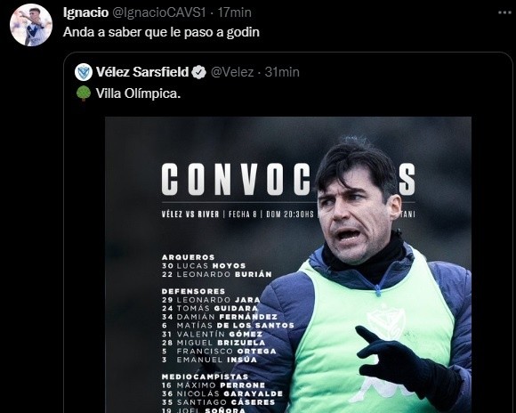 A falta de un día para el partido, la cuenta oficial de Vélez publicó la lista de convocados de Medina y todos los fanáticos quedaron muy sorprendidos e indignados al ver que Diego Godín, quien solo jugó unos minutos con River y otros 45 ante Colón, no estaba dentro de la nómina que recibe al Millonario.