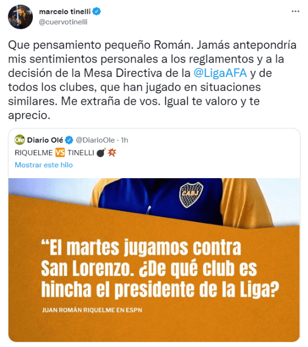 Además, Román apuntó contra Tinelli por no haberle suspendido el partido al Xeneize contra el Ciclón:“el martes jugamos con San Lorenzoy, ¿de quéclub es hincha el Presidente de la Liga?”. Después de que se viralizaran las declaraciones de Riquelme, Marcelo Tinelli le respondió al ídolo azul y oro.