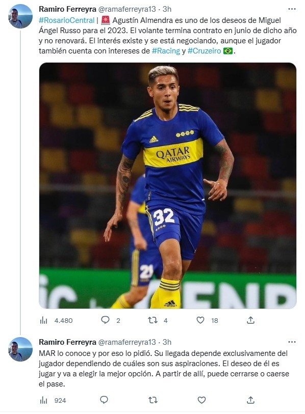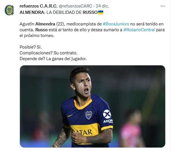Agustín Almendra supo mostrar su mejor versión de la mano de Russo en el Xeneize y el DT sueña con dirigirlo otra vez, según informan medios rosarinos. Sin embargo, el Canalla no la tendrá fácil a la hora de negociar: también compiten Cruzeiro y Flamengo para quedarse con el mediocampista de 22 años.