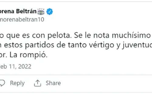 “Y lo claro que es con pelota. Se le nota muchísimo el oficio en estos partidos de tanto vértigo y juventud alrededor. La rompió”, cerró la periodista de ESPN. ¡Pavada de reconocimiento!