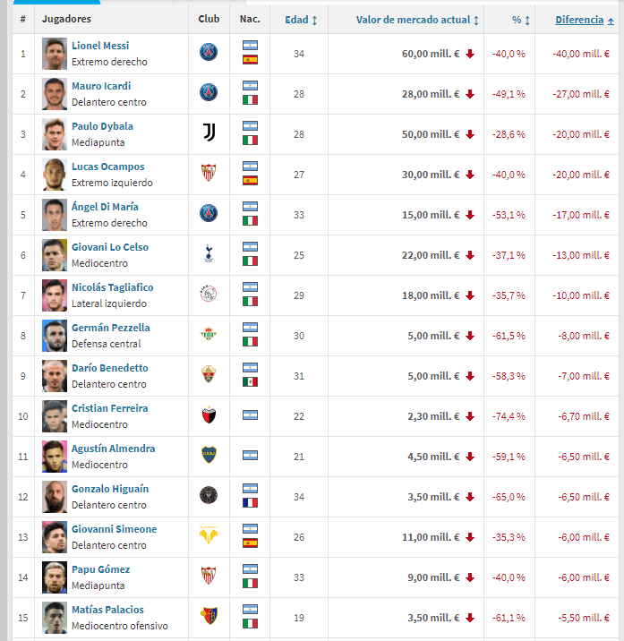 El 2021 va llegando a su fin y las estadísticas finales dejan noticias impactantes. Difíciles de procesar, pero con datos irrefutables.Por ejemplo, el increíble ranking de los cinco futbolistas argentinos que más de desvalorizaron durante la temporada que culminó. Claro, dentro de este hay tres habituales de la Selección Argentina.