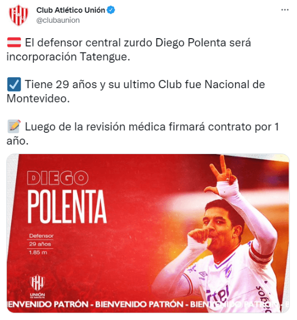 Pasados los años, el defensorcaracterizado por su fuerza, presencia y liderazgo dentro del campo de juego,vivirá su primera experiencia en el fútbol argentino luego de haber quedado libre de Nacional. Polenta fue oficializado por Unión de Santa Fe para la presente temporada y el Tatengue adquiere un central de jerarquía, que también había sido pretendido por Platense en este mercado. Una llegada de gran nivel.