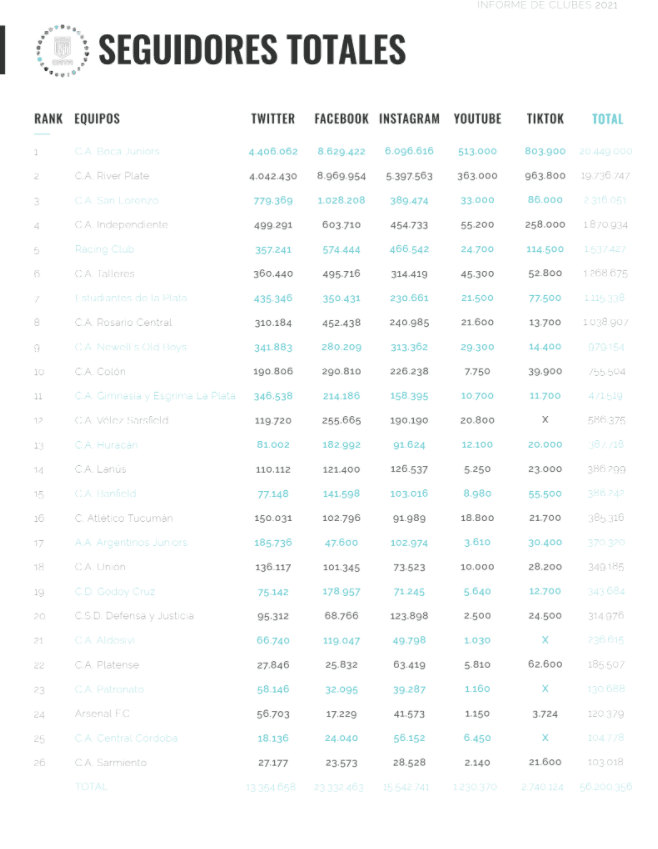 Además del ranking de socios, La AFA publicó la lista de los equipos con más seguidores en las redes sociales (Twitter, Facebook,Instagram, Youtube y TikTok).Boca lidera con 20.449.000, River lo sigue de cerca con19.736.747. Luego aparecen San Lorenzo (2.316.051),Independiente (1.870.934) y Racing (1.537.447).