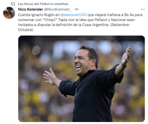 ¿El motivo? Ruglio le hará una histórica propuesta a “Chiqui” para que Peñarol y Nacional puedan incorporarse como invitados en las últimas instancias de la Copa Argentina que se está desarrollando actualmente.“Puede ser un condimento para la Copa invitar a los dos grandes de Uruguay. En setiembre y octubre lastimosamente casi siempre llegamos los dos eliminados de los campeonatos internacionales, si todos los años en esa época no tenemos doble competencia por qué no ir a buscarla y en vez de ser banca, ser punto contra Boca o River”, expresó el mandamás del Carbonero.