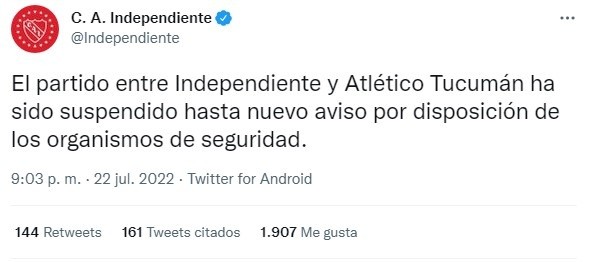 La realidad es queIndependiente vs. Atlético Tucumán se suspendió por los incidentes acontecidos en la asamblea de socios del cuadro de Avellaneda, quienes viven un clima institucional muy caliente y eso se hizo notar en dicho acto, donde muchos hinchas se manifestaron en la sede social contra el actual presidente, Hugo Moyano, y el mismo culminó con la policía combatiendo contra los simpatizantes.