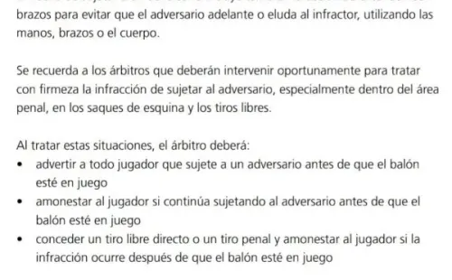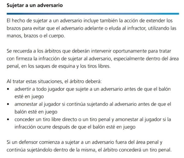 La regla 12 que proporciona la FIFA indica que “si un defensor comienza a sujetar a un adversario fuera del área penal y continua sujetándolo dentro de la misma, el árbitro concederá tu tiro penal”, texto que describe casi a la perfección lo que ocurrió cerca del final del primer tiempo en el Libertadores de América. Se disipa la polémica.