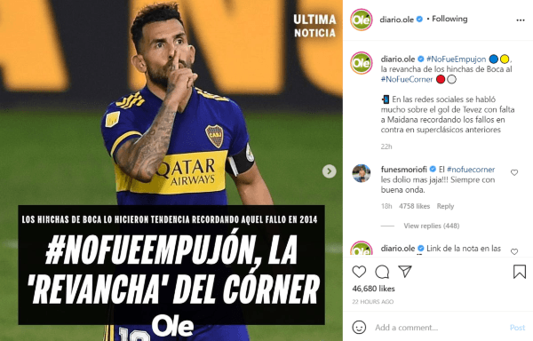 Al instante, los hinchas del Millonario crearon el #NoFueCorner, para burlar a los del eterno rival y hacerse eco del fallo que tuvo el juez en dicha ocasión. Más de siete años después, llegó la venganza de los fanáticos del Xeneize, ya que después de mucho tiempo lograron ganarle un mano a mano al Millonario, en esta ocasión por los cuartos de final de la Copa de la Liga.