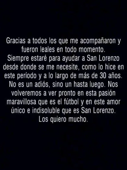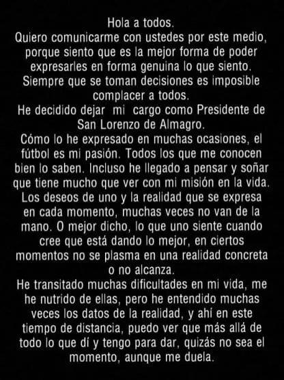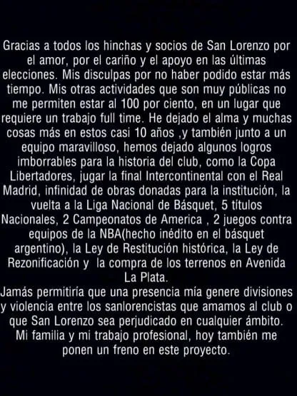 Mediante un comunicado que posteó en las redes sociales, Tinelli se despidió de los hinchas que lo apoyaron durante las últimas elecciones y pidió “disculpas por no poder estar más tiempo en el club”. Además, resaltó que decidió presentar su renuncia porque no puede “dedicarle el 100%” de su tiempo al club.