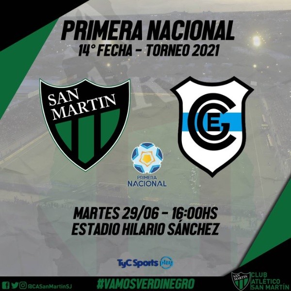 Por una nueva jornada de laPrimera Nacional,San Martín de San Juanrecibe en su estadio la resistencia deGimnasia y Esgrima de Jujuyen un duelo que está pautado para disputarse este martes 29 de junio.Las emociones de este compromiso serán transmitidasEN VIVO Y EN DIRECTOa través de la pantalla deTYC SPORTS PLAY.