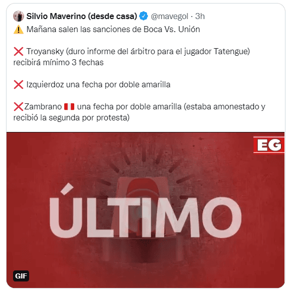 Si bien no hubo anuncio oficial, el periodista Silvio Maverino adelantó paraEl Gráficoque el jugador del Tatengue, protagonista de los incidentes, será castigado con tres fechas en el campeonatoy el zaguero peruano solo deberá cumplir una jornada de suspensión por la doble amonestación que recibió por su protesta.