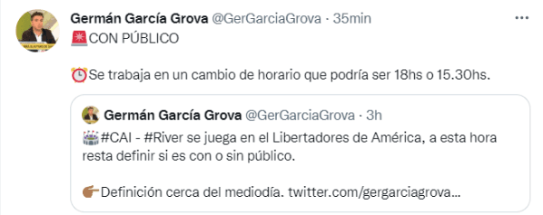 “Se trabaja en un cambio de horario que podría ser 18hs o 15.30hs”, agregó Grova a través de su cuenta de Twitter. Si bien las autoridades de la Liga Profesional no tienen estipulado la modificación de la agenda, es la seguridad quien presiona para adelantar el cotejo programado para las 20:30 horas del próximo domingo. Serán días de resoluciones.