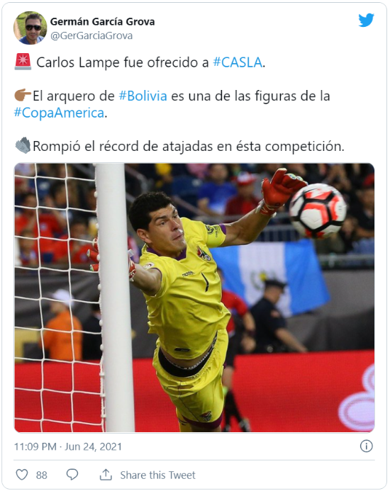 Se trata de Carlos Lampe, el arquero boliviano que llegó en el segundo semestre de aquel año para cubrir la ausencia de Esteban Andrada. Según informó César Luis Merlo, el jugador fue ofrecido al club de Boedo, quien ahora tiene a Mauro Cetto a cargo del fútbol y a Paolo Montero como DT.