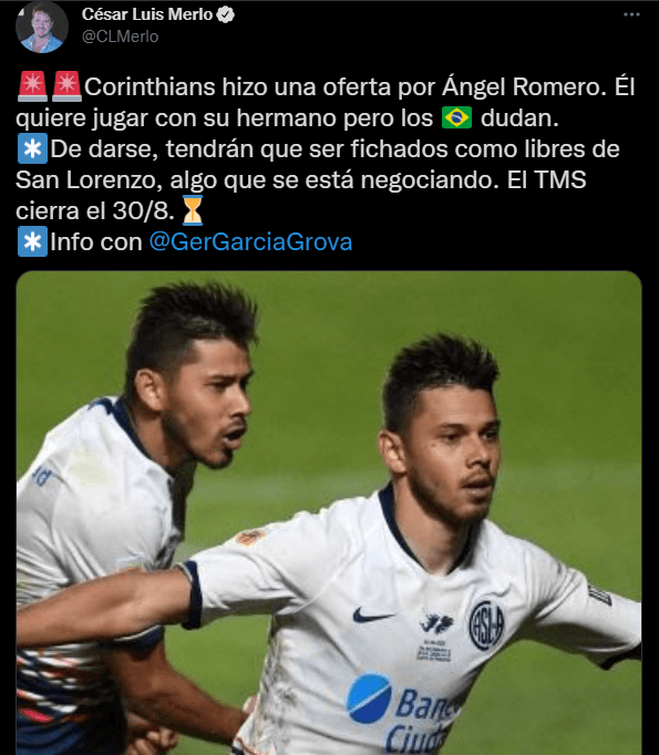 Logicamente, los mellizos quieren seguir jugando juntos, pero una oferta podría arruinarles la ilusión. Según informaron César Luis Merlo y Germán García Grova, Ángel Romero podría seguir su carrera en un equipo que ya lo conoce como lo es el Corinthians brasileño.
