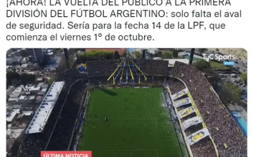 Según informó TyC Sports durante este mediodía, solo resta el aval de la seguridad en los estadios para que se habilite oficialmente el regreso del público a las canchas con un aforo del 50%. La fecha señalada sería el próximo viernes 1 de octubre, en la apertura de la fecha 14 de la Liga Profesional. Ese día juegan Aldosivi-Unión en Mar del Plata y Lanús-Central Córdoba en el Sur.