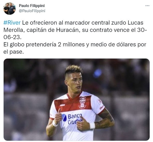 Sin embargo, a poco más de seis meses del vencimiento de su contrato, el representante del futbolista le está buscando nuevos rumbos y en las últimas horas se dio a conocer que Merolla fue ofrecido ni más ni menos que a River Plate. Así lo informó el periodista Paulo Filippini: “El Globo pretendería 2 millones y medio de dólares por el pase”.