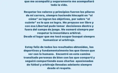 “Me espera un nuevo camino, con otros desafíos y la seguridad de sentir que estoy en paz, que estoy tranquilo porque he logrado la credibilidad, el respeto y el prestigio por los que tanto trabajé”, expresó el juez de 47 años, que viene de impartir justicia en la final de la Copa Libertadores entre Flamengo y Paranaense. ¡Muchos éxitos, Pato!