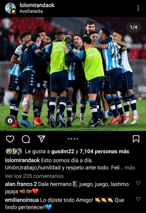 En un posteo de Miranda que mostraba a todos los jugadores de Racing festejando el triunfo, Alan Franco, jugador que surgió de Independiente en el 2016 colocó la frase; “Dale hermano, juego, juego, lastimo jajaja” con algunos emojis que demuestran el cariño que se tienen con el volante.