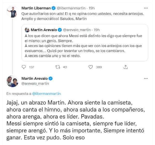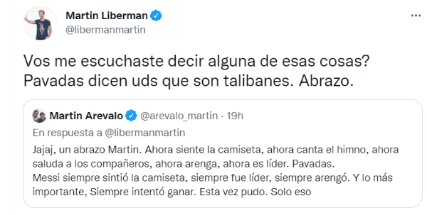 Sin embargo, siguen existiendo posturas muy diferentes y eso quedó claro en las redes sociales. Sin ir más lejos, en Twitter tuvo lugar un fuerte cruce entre dos periodistas deportivos argentinos muy reconocidos: Martín Liberman y Martín Arévalo.