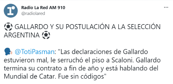 Fue esto último lo que generó más revuelo, y el periodista Toti Pasman despertó la polémica con su reflexión tras escuchar al Muñeco: “Las declaraciones de Gallardo estuvieron mal, le serruchó el piso a Scaloni. Gallardo termina su contrato a fin de año y está hablando del Mundial de Catar. Fue sin códigos”, dijo en Radio La Red.