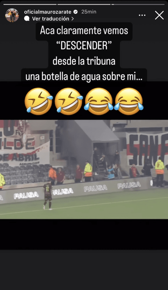 Resulta que Mauro se retiró del campo de juego y un hincha le arrojó una botella. El delantero compartió ese momento y escribió: “Acá claramente vemos DESCENDER desde la tribuna una botella de agua sobre mi…”. Con emojis de risa inluidos.