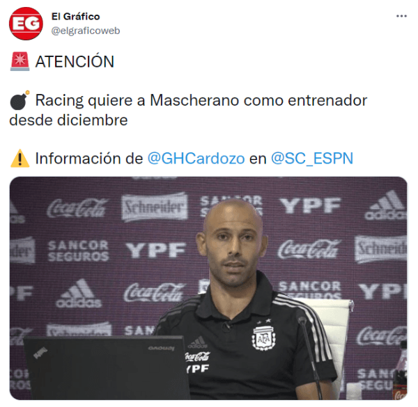 El exfutbolista del Liverpool, Barcelona y River firmó un acuerdo con la Asociación del Fútbol Argentino por un año y el mismo vence en diciembre. Por este motivo y, ante la salida de Juan Antonio Pizzi, Racing entabló conversaciones con Javier Mascherano para que sea el nuevo entrenador de la Academia a partir de fines de este año.