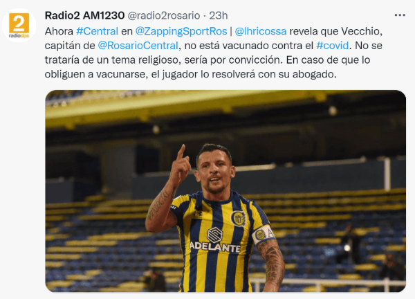 En el caso de Rosario Central, según la información que brindó el periodista de Radio 2 de Rosario, Luis Ricossa, el futbolista Emiliano Vecchio aún no está inoculado y tampoco desea hacerlo. “No se trataría de un tema religioso, sería por convicción. En caso de que lo obliguen a vacunarse, el jugador lo resolverá con su abogado”, indicó.