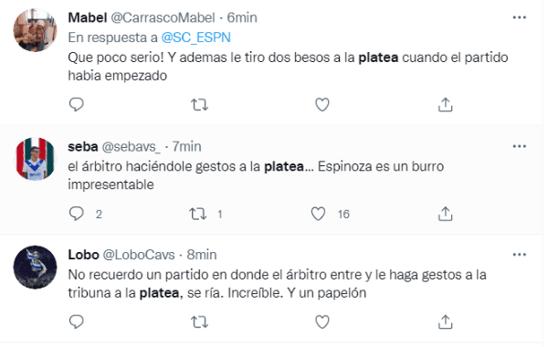 Como si fuera poco, Espinoza contraatacó con un gesto provocador que hizo explotar a la platea. El árbitro comenzó a lanzarle besos a los hinchas y la temperatura del partido subió como nunca. Pocas veces se vio algo así en una cancha por parte de una autoridad del fútbol argentino.