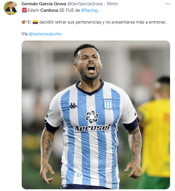 A partir de ese episodio, Cardona fue separado del plantel por decisión deFernando Gagoy que no iba a jugar en todo lo que queda de 2022 era un secreto a voces. Es por eso que, tras no ser convocado para el desempate contra Tigre, Edwin armó las valijas, se llevó todo del Cilindro y tomó un avión a su país. ¿Cómo sigue la novela?