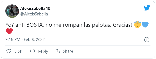 El hombre en cuestión es Alexis Sabella, mediocampista de 20 años que ya suma unos cuantos partidos en la Primera del club de Boedo. Pasadas las 21, el volante sorprendió a todos con un fuerte mensaje: “Yo? anti BOSTA, no me rompan las pelotas. Gracias!”.