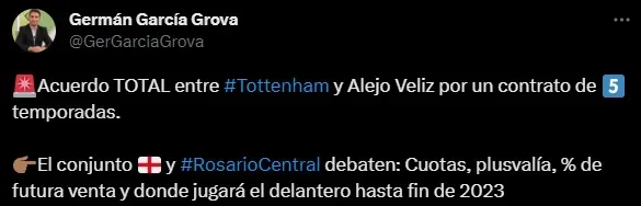 Decidido a quedarse con la joya argentina, el equipo inglés tendría “un acuerdo total”, según informó Germán García Grova, con Rosario Central y pagaría cerca de 15 millones de euros para quedarse con el pase de Alejo Veliz en este mercado.