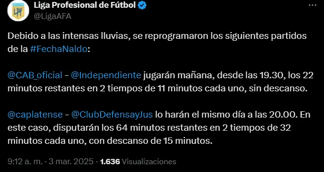 Platense y Defensa, en cambio, jugarán los 64 minutos restantes en dos tiempos de 32′ ese mismo martes a las 20:00 en Vicente López. A diferencia del primer encuentro que se reanudará, en este sí habrá 15′ de descanso entre tiempo y tiempo. El Halcón se encuentra ganando el partido por 1 a 0 gracias al tempranero gol de Matías Miranda.