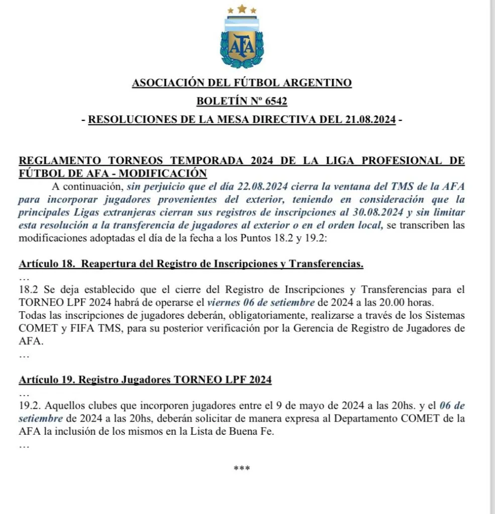 “Sin perjuicio que el día 22/08/2024 cierra la ventana del TMS de la AFA para incorporar jugadores provenientes del exterior, teniendo en consideración que las principales ligas extranjeras cierran sus registros de inscripción el 30/08/2024 y sin limitar esta resolución a la transferencia de jugadores al exterior o en el orden local, se transcriben las modificaciones adoptadas el día de la fecha.