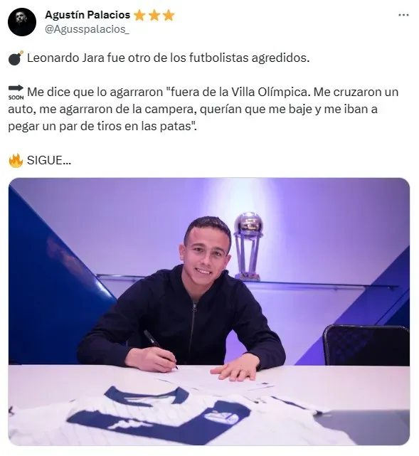 Agustín Palacios, periodista partidario en Vélez a Fondo, reveló declaraciones exclusivas de uno de los referentes del plantel profesional tras la apretada por parte de la barra. “Me cruzaron un auto, me agarraron de la campera, querían que me baje y dijeron que me iban a pegar un par de tiros en las patas”, le habría dicho Leo Jara después del violento episodio en la Villa Olímpica.