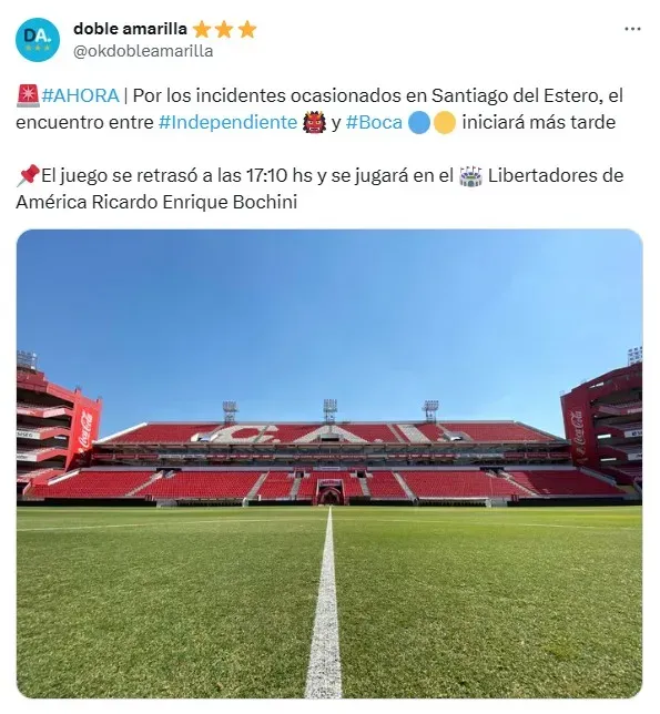 Todo estaba listo para que el pitazo inicial tenga lugar a partir de las 17 horas de este sábado. Sin embargo, los incidentes que tuvieron lugar en el Estadio Madre de Ciudades durante el Central Córdoba – Atlético Tucumán (demorado por casi 30 minutos) obligaron a las autoridades de la Liga Profesional a modificar el horario del clásico en Avellaneda.