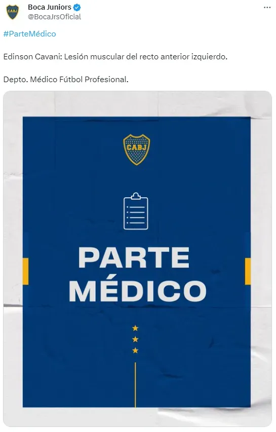 Es que Cavani iba a ser citado por Marcelo Bielsa para los próximos partidos de Eliminatorias, pero finalmente quedó fuera de la lista. El Departamento Médico del club informó este lunes la lesión que tiene el uruguayo: “Lesión muscular del recto anterior izquierdo“.