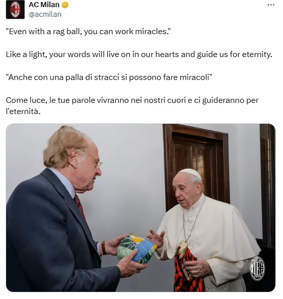 Inter y Milan también se sumaron a los mensajes. ”El FC Internazionale Milano se une al duelo por el fallecimiento del Papa Francisco, un hombre de fe, humildad y diálogo, capaz de hablar al corazón de todos”, se puede leer en el usuario de X del Nerazzurro. Y en cuanto al Rossonero, hizo una analogía futbolística para despedir a Francisco: “Incluso con una pelota de trapo se pueden hacer milagros. Como una luz, tus palabras vivirán en nuestros corazones y nos guiarán por la eternidad”.