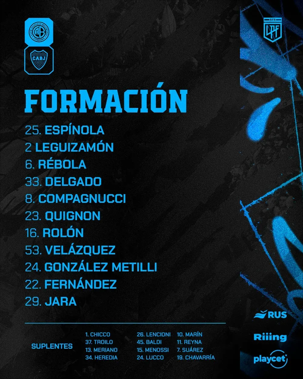 Boca: Leandro Brey; Juan Barinaga, Aaron Anselmino, Nicolás Figal, Lautaro Blanco; Cristian Medina, Milton Delgado, Tomás Belmonte, Kevin Zenón; Edinson Cavani y Miguel Merentiel.