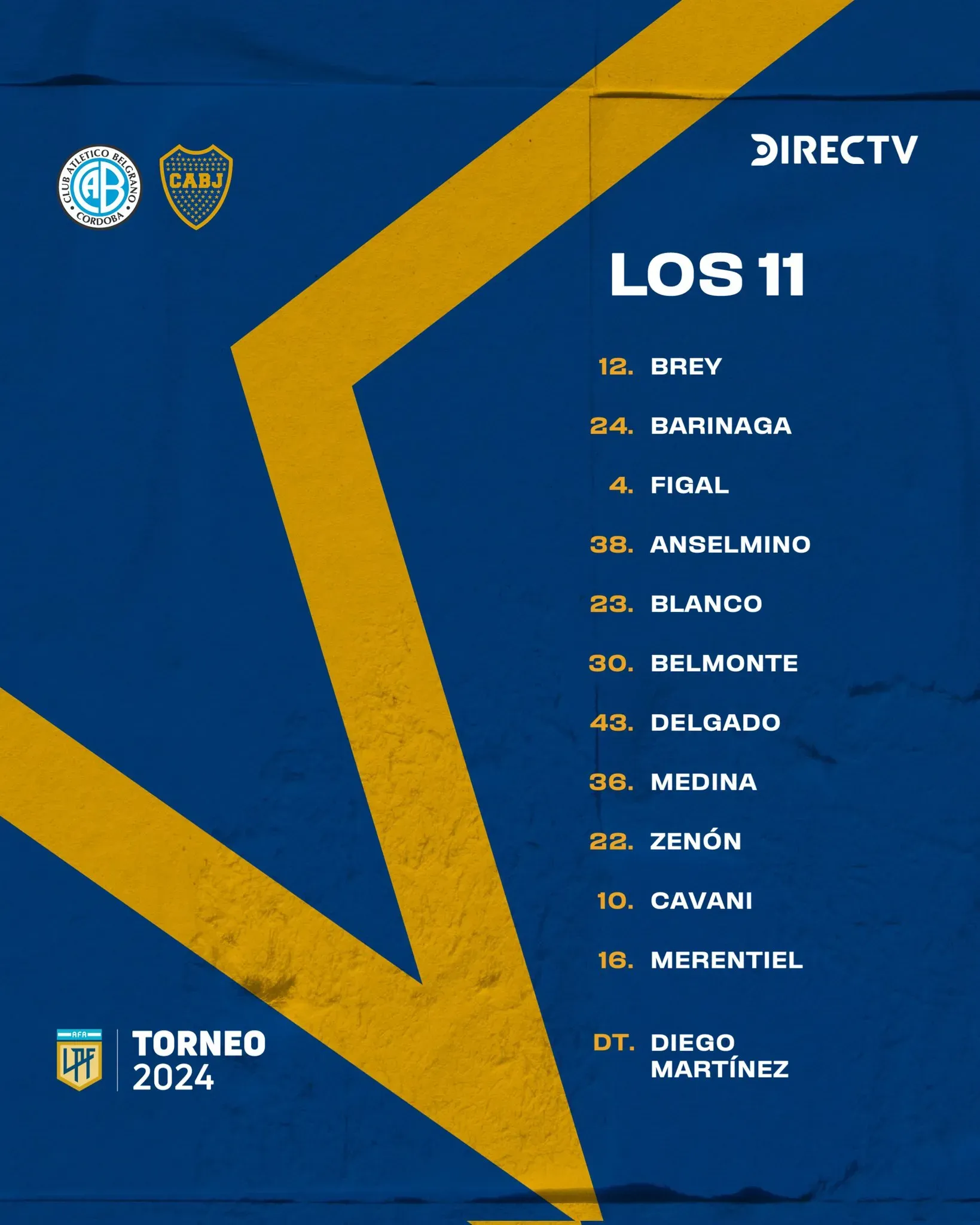 Para enfrentar a Belgrano, el entrenador de Boca definió que los titulares sean Leandro Brey; Juan Barinaga, Nicolás Figal, Aaron Anselmino, Lautaro Blanco; Cristian Medina, Milton Delgado, Tomás Belmonte, Kevin Zenón; Edinson Cavani y Miguel Merentiel.