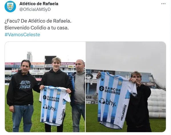 Allí, el delantero del Nerazzurri posó con la camiseta de Rafaela que se le fue obsequiada y, a través de Twitter, la cuenta de La Crema le dedicó un pequeño texto. “¿Facu? De Atlético de Rafaela. Bienvenido Colidio a tu casa. Vamos Celeste”, posteó la institución santafesina vía canales oficiales. ¿Quién iba a imaginar que esa sería la casaca que iba a portar el delantero en medio de tantos rumores durante esta semana?