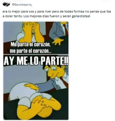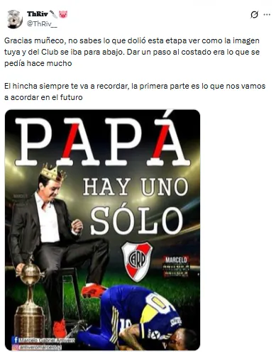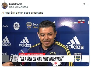 En redes sociales, los memes no tardaron en aflorar. Los seguidores del Millonario se hicieron presentes con emotivas imágenes, pero el resto de los equipos del fútbol argentino celebró esta decisión del Muñeco. Sobre todo, los hinchas de Boca bromearon con los empujones que Claudio Úbeda y Guillermo Barros Schelotto le dieron a Gallardo.