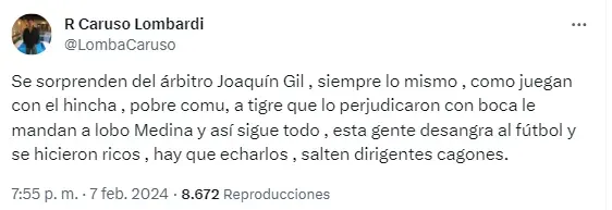 Y se extendió denunciando más irregularidades e involucrando a Boca Juniors y su reciente triunfo ante el Matador de Victoria: “A tigre que lo perjudicaron con Boca. Le mandan a Lobo Medina (Asistente en el VAR) y así sigue todo. Esta gente desangra al fútbol y se hicieron ricos, hay que echarlos. Salten dirigentes cagones“.